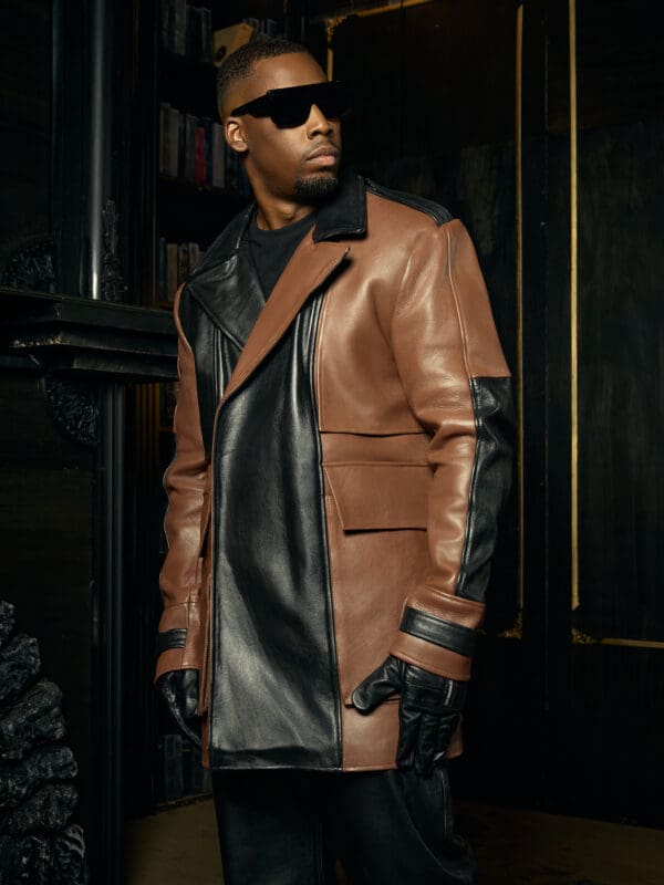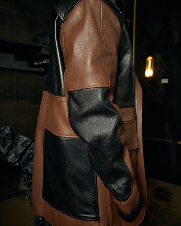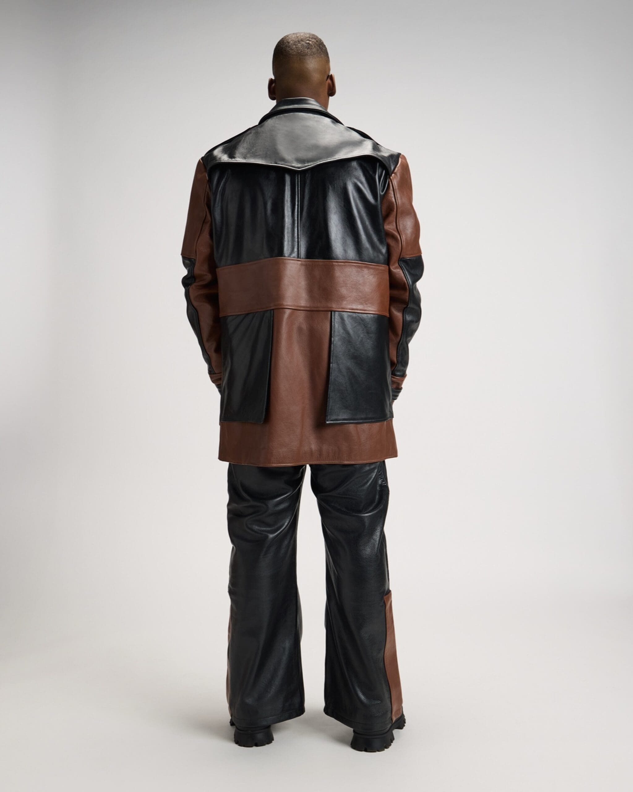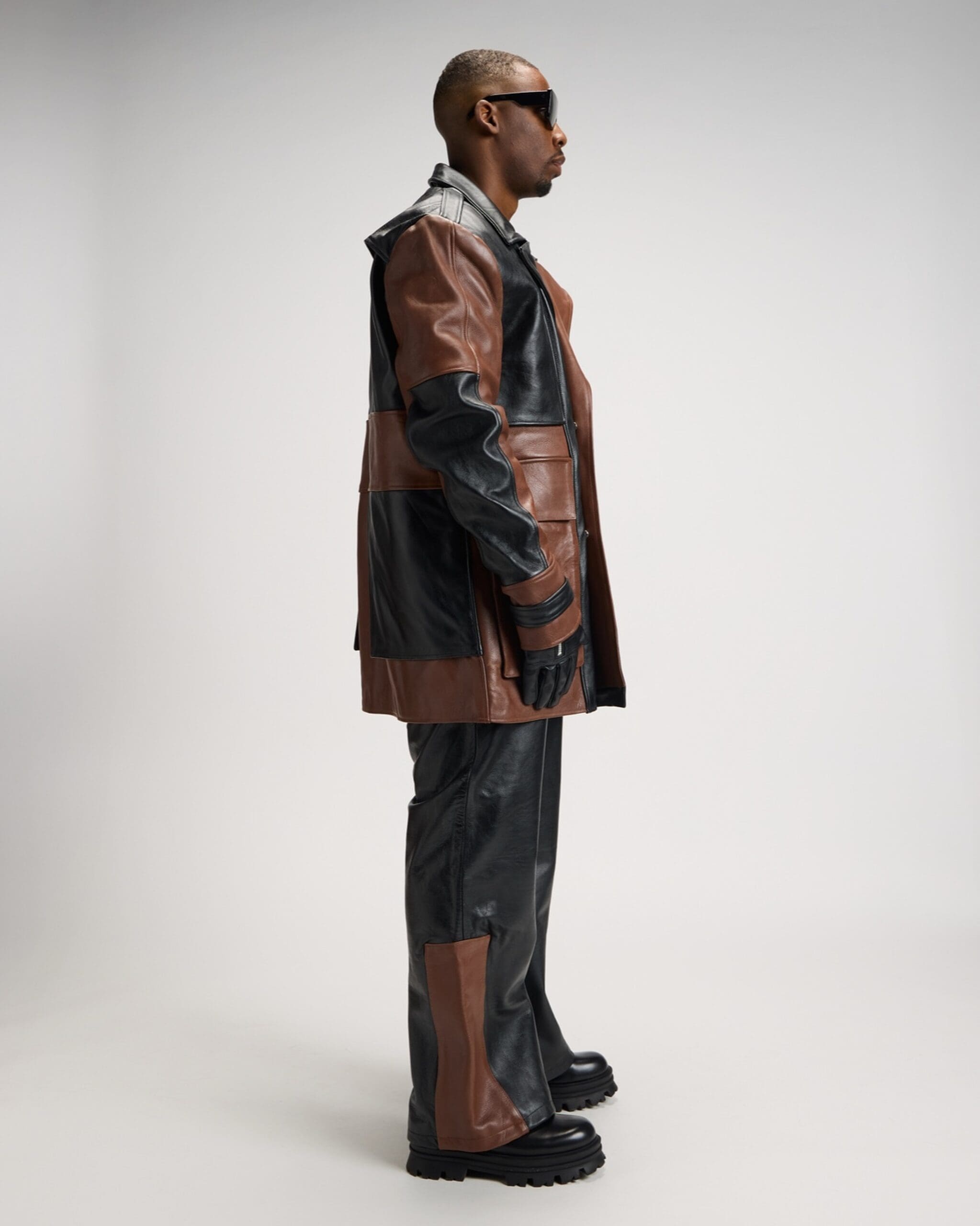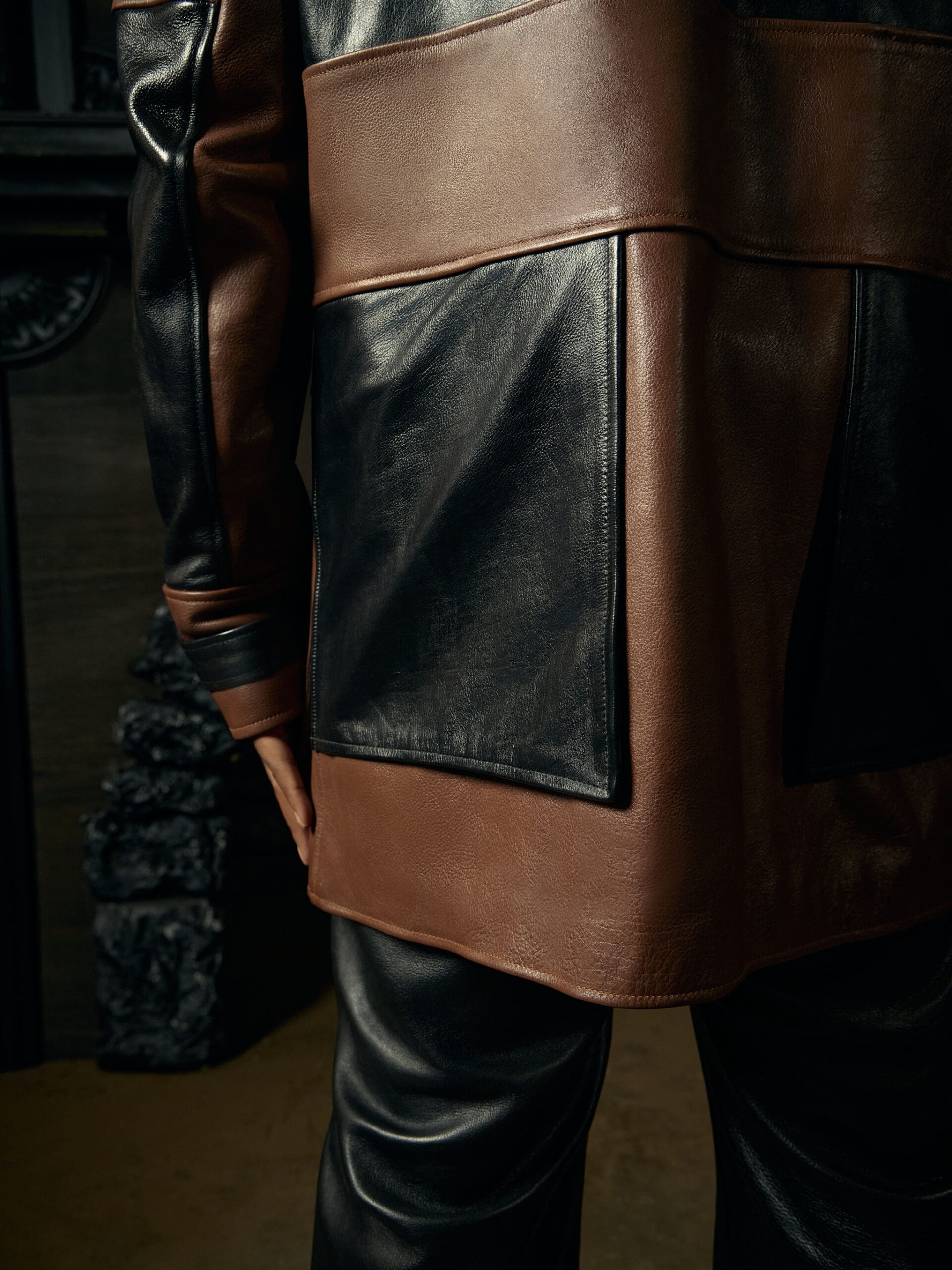 Full-grain cowhide leather in Matte Black / Saddle Brown with sculptural contrast paneling. Extended-length jacket with dropped-back lapels, oversized pockets, double cuff wraps, and satin lining.